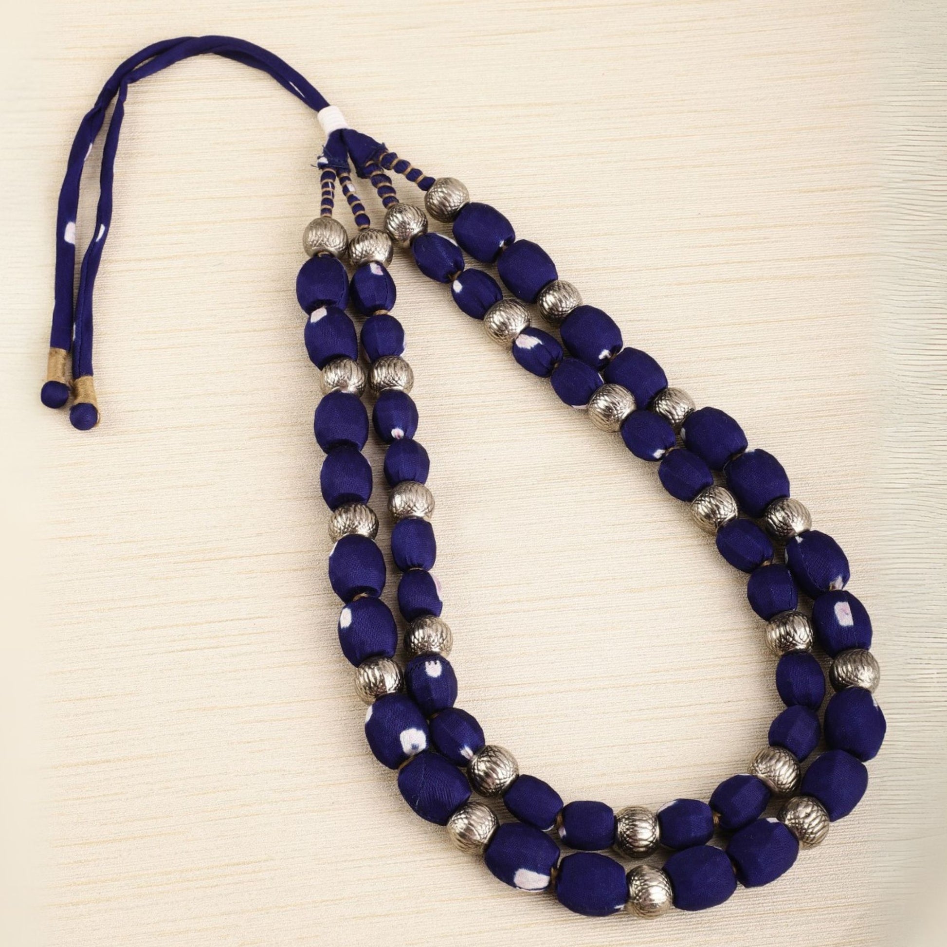 2 layer handmade fabric beaded necklace in bandhni silk highlighted with metal beads with an adjustable clasp. This zero-waste neckpiece is light and comfortable to wear and blends well with indian and western wear. Comes packed in a fabric pouch and is a perfect gifting option.