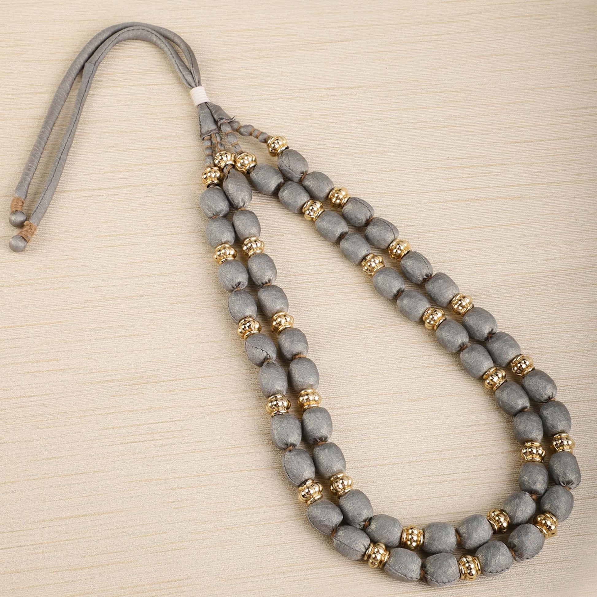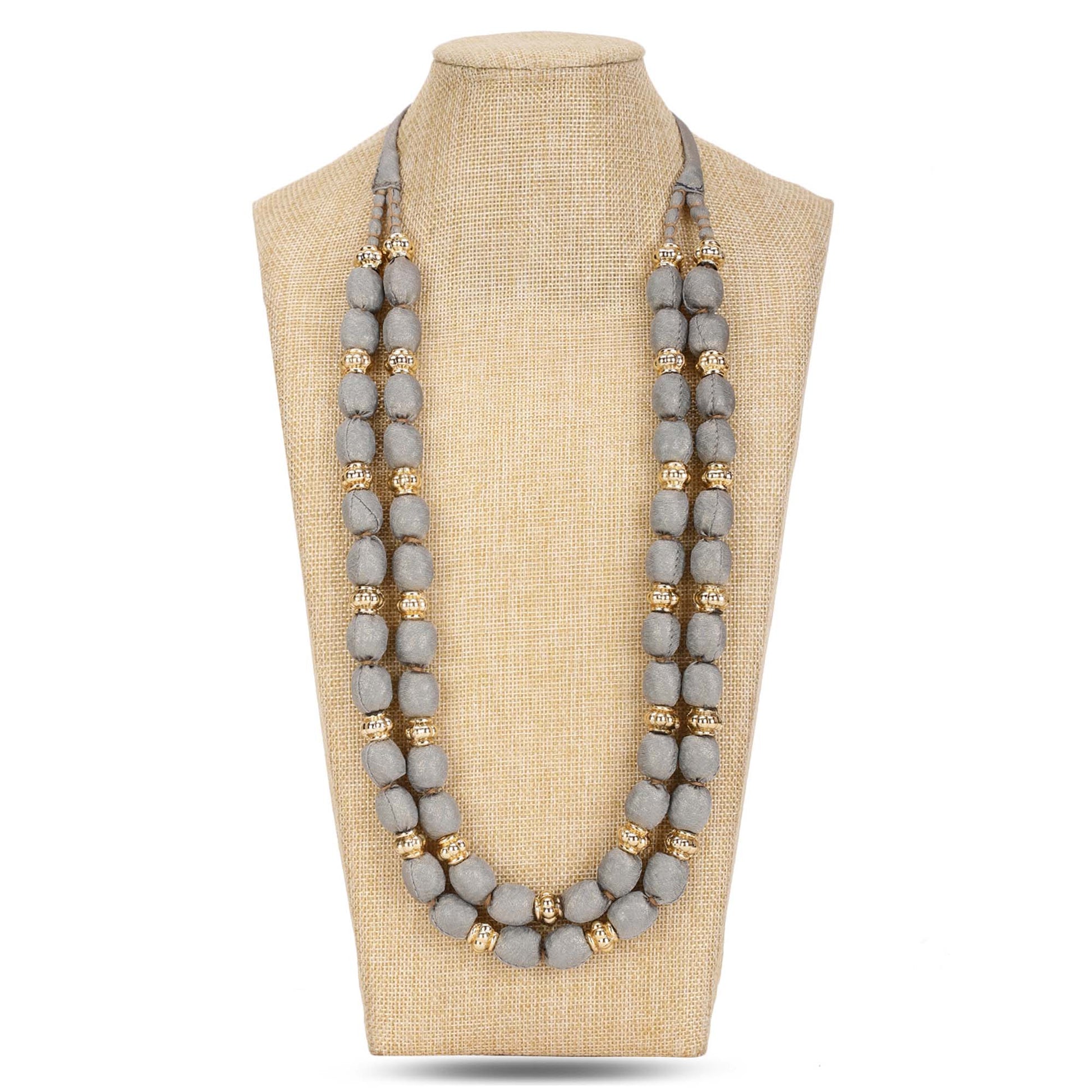 2 layer handmade fabric beaded necklace in grey silk highlighted with metal beads with an adjustable clasp. This zero-waste neckpiece is light and comfortable to wear and blends well with indian and western wear. Comes packed in a fabric pouch and is a perfect gifting option.