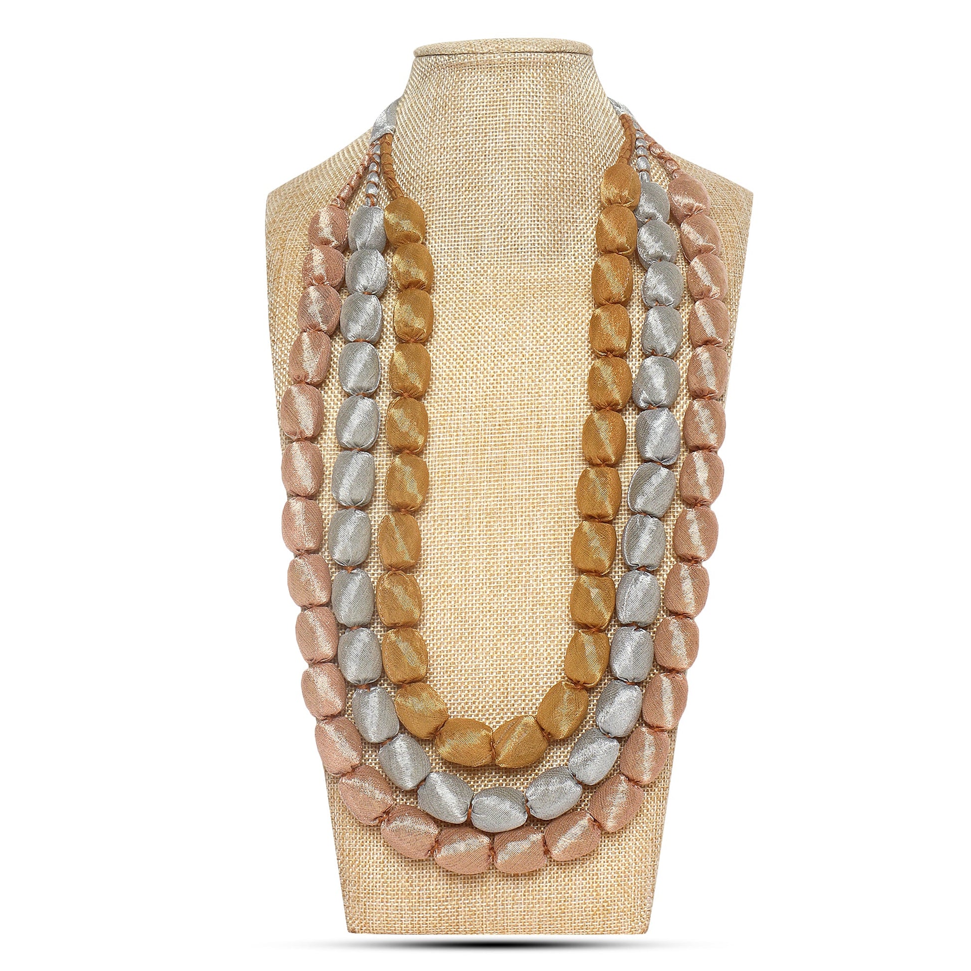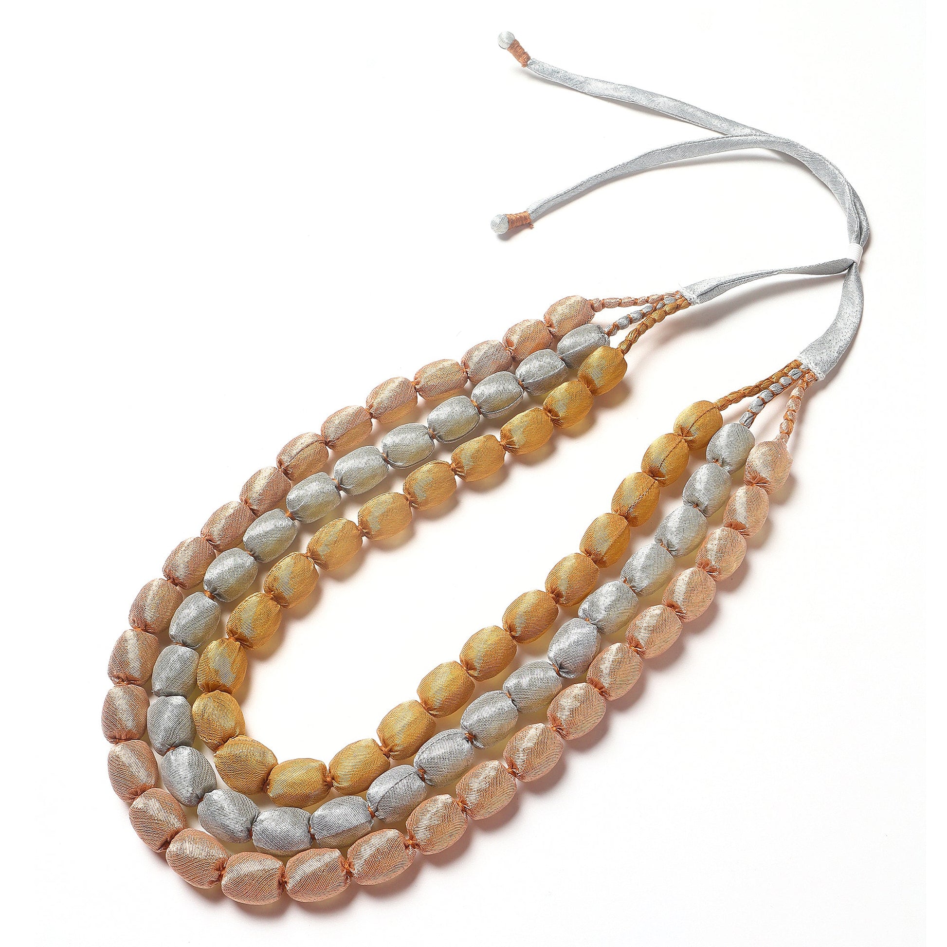 3 layer handmade fabric beaded necklace in silk tissue in metallic tones with an adjustable clasp. This zero-waste neckpiece is light and comfortable to wear and blends well with indian and western wear. Comes packed in a fabric pouch and is a perfect gifting option.