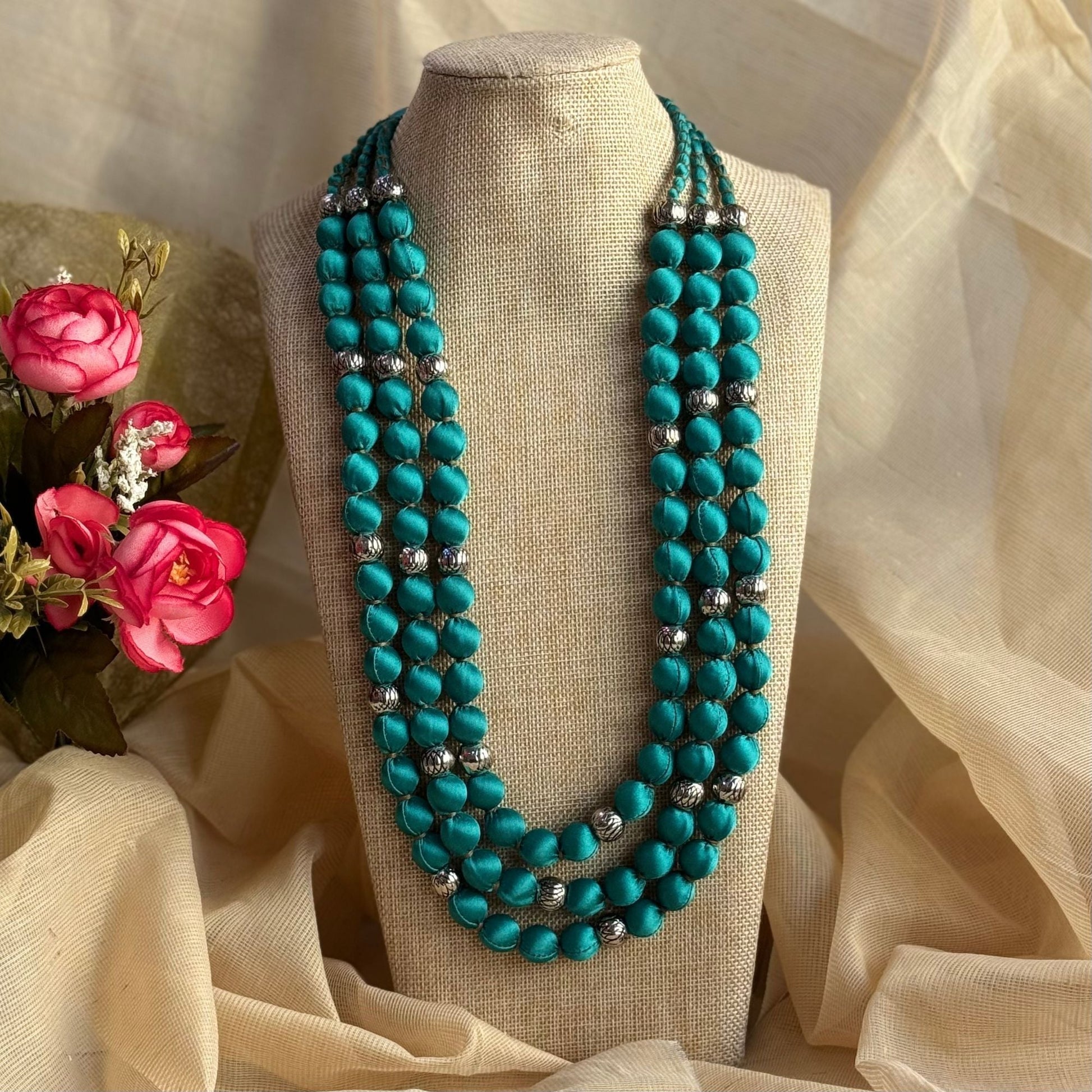 3 layer handmade fabric beaded necklace in satin highlighted with metal beads and comes with an adjustable clasp. This zero-waste neckpiece is light and comfortable to wear and blends well with indian and western wear. Comes packed in a fabric pouch and is a perfect gifting option.