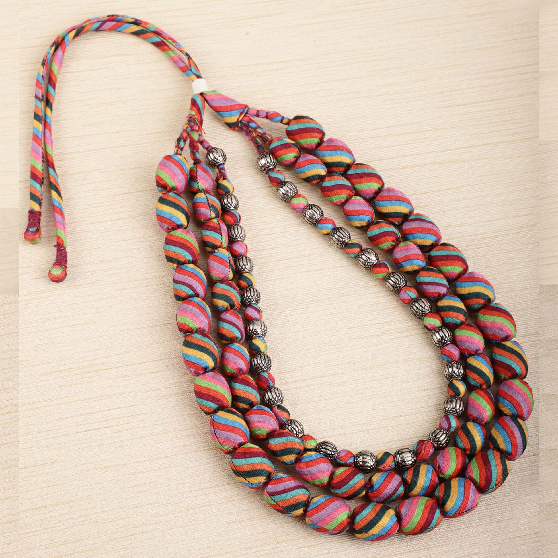 3 layer handmade fabric beaded necklace in multi colored pin-stripe silk highlighted with metal beads with an adjustable clasp. This zero-waste neckpiece is light and comfortable to wear and blends well with indian and western wear. Comes packed in a fabric pouch and is a perfect gifting option.