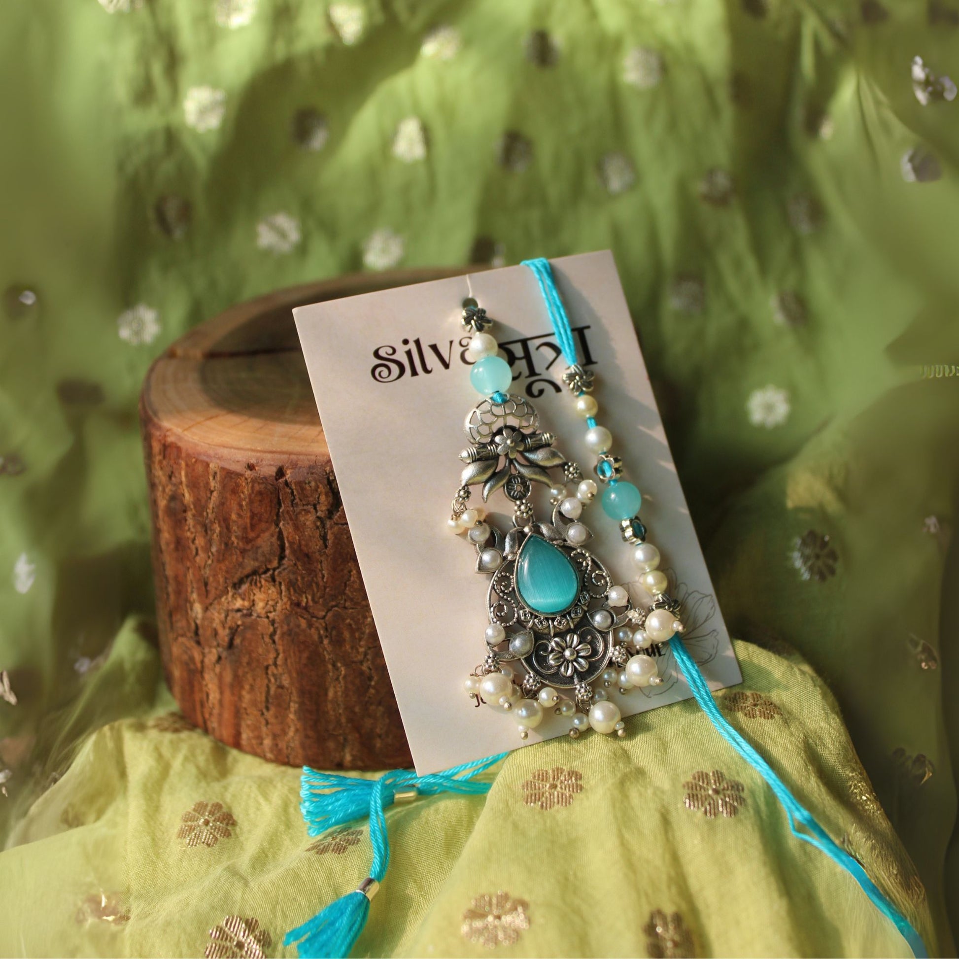 A Set of 2 couple silver-toned rakhis with an aqua-blue centerpiece, complemented by another pearls and blue beads rakhi.