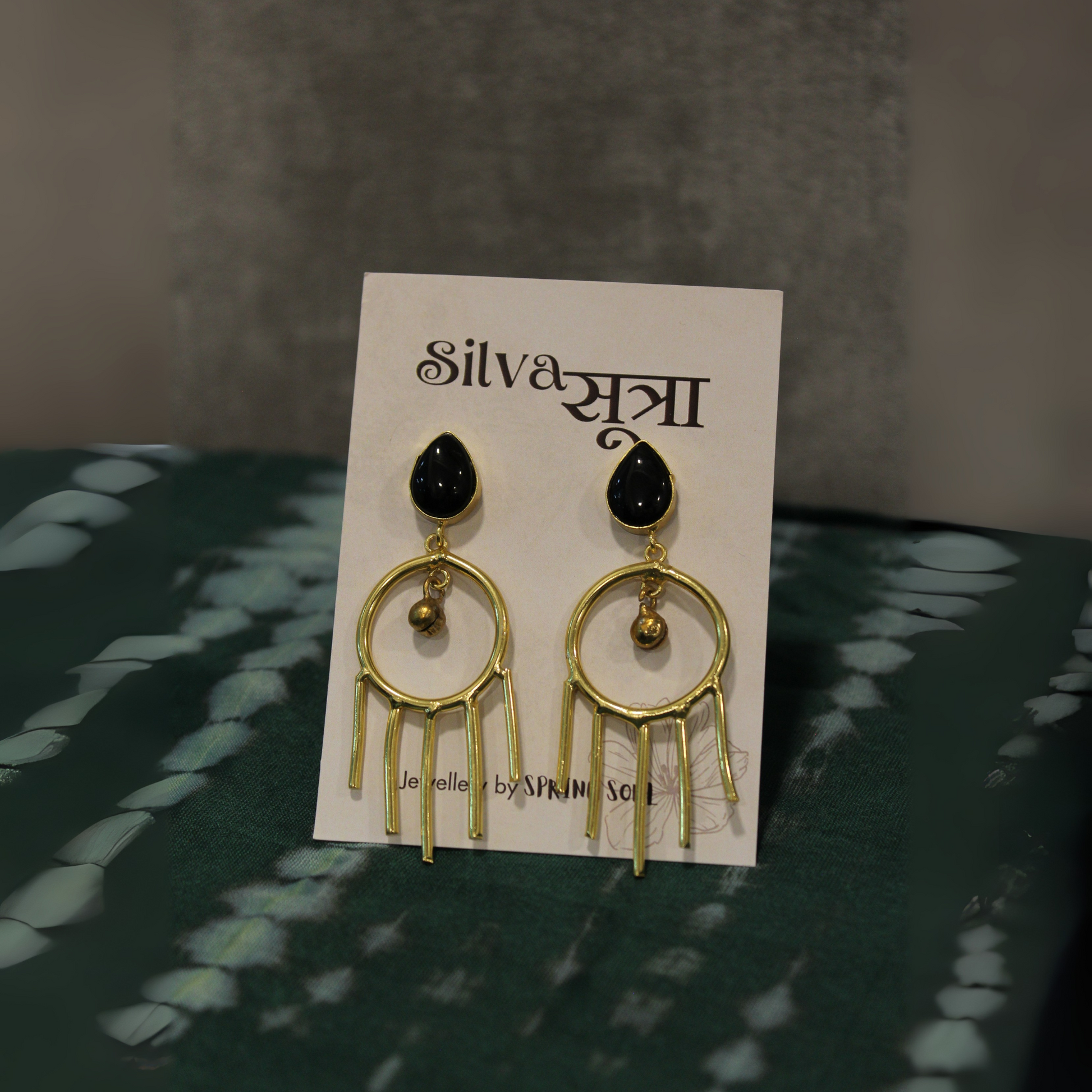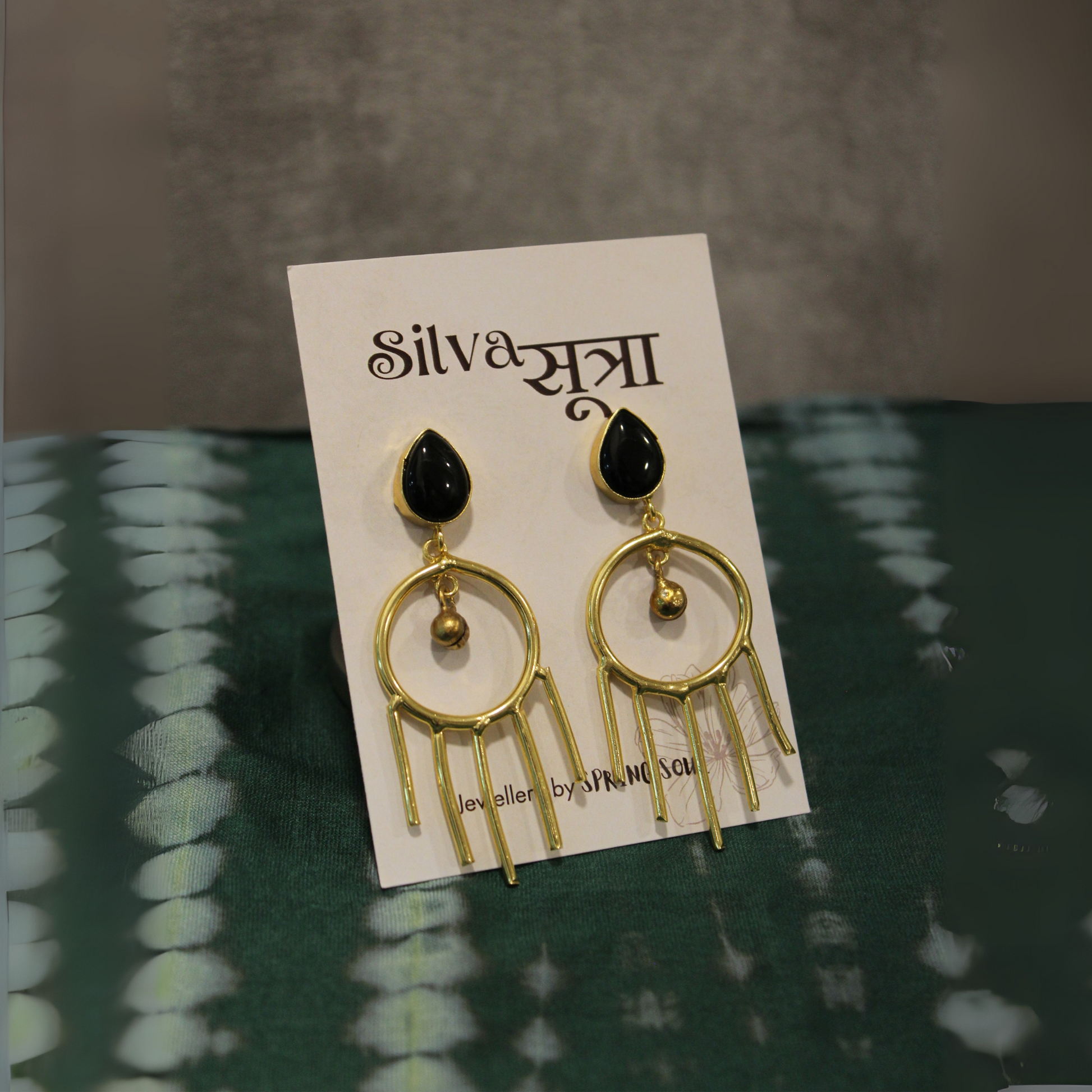 These striking earrings feature a black teardrop stud leading to a bold, gold-toned circular hoop. A small golden bead dangles within the hoop, from which multiple linear gold bars extend, creating a modern, statement-making fringe effect.
