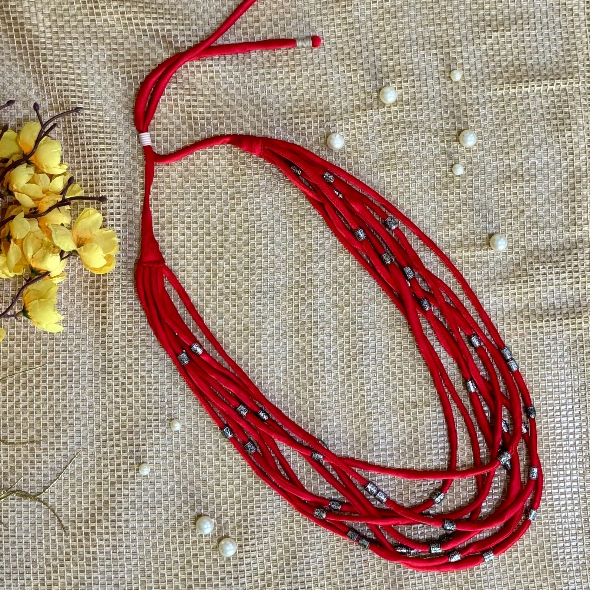 Handmade layerd fabric beaded strings in mashru highlighted with metal beads and comes with an adjustable clasp. This zero-waste neckpiece is light and comfortable to wear and blends well with indian and western wear. Comes packed in a fabric pouch and is a perfect gifting option.