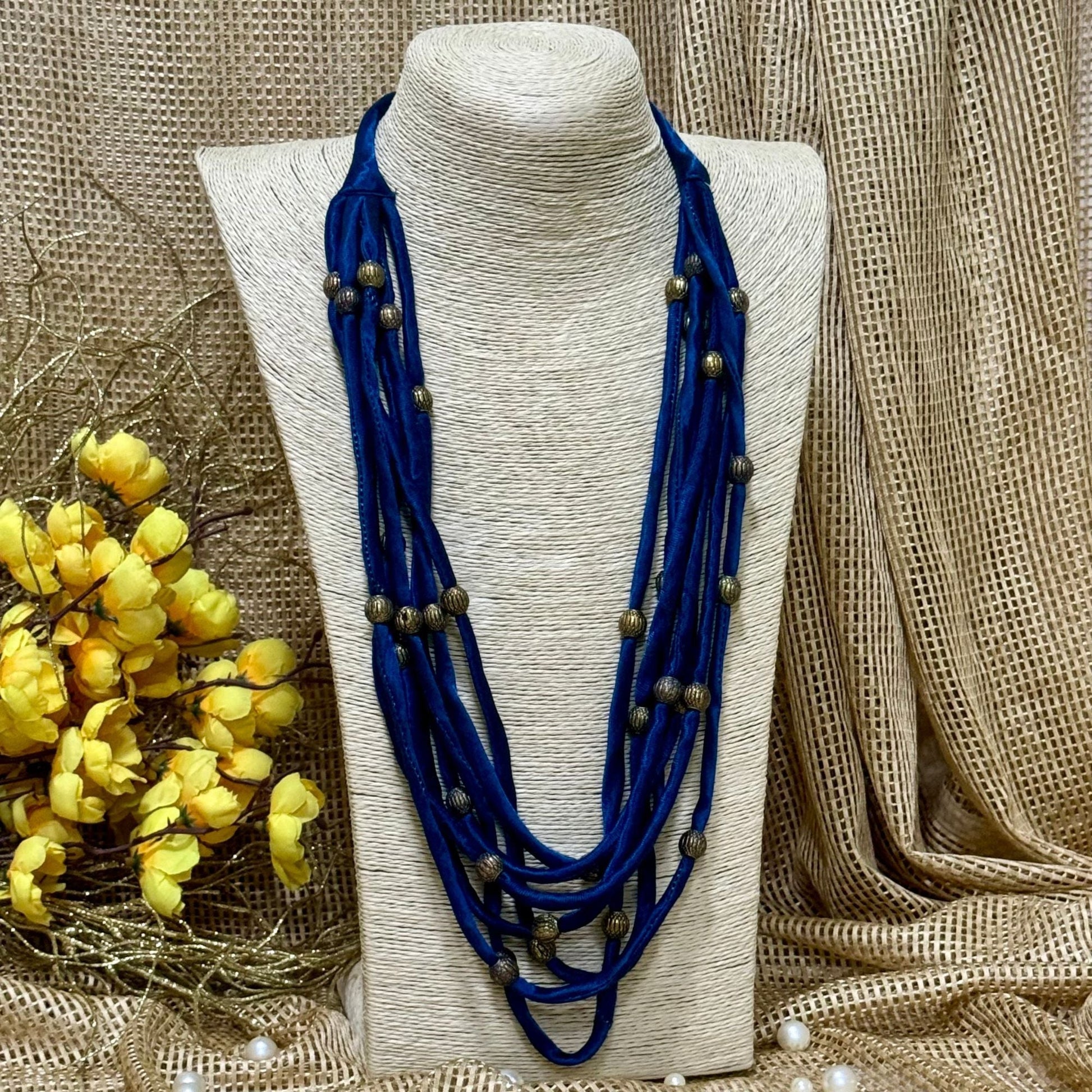 Handmade layerd fabric beaded strings in mashru highlighted with metal beads and comes with an adjustable clasp. This zero-waste neckpiece is light and comfortable to wear and blends well with indian and western wear. Comes packed in a fabric pouch and is a perfect gifting option.