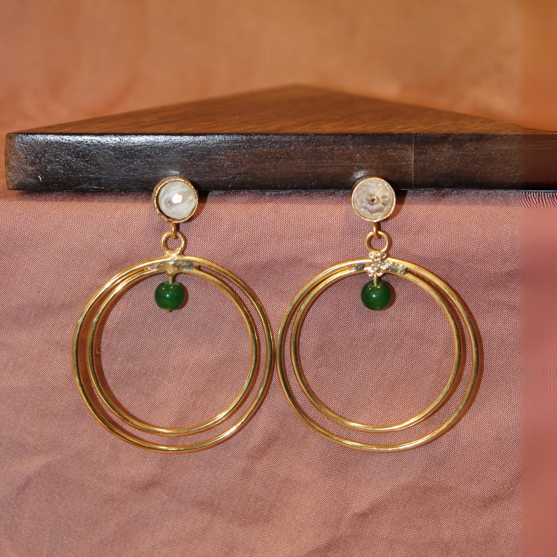 Retro-inspired gold-toned hoop earrings featuring a clear stone stud and a dangling green stone. The double hoop design adds a unique, vintage touch. These earrings have a hook closure.