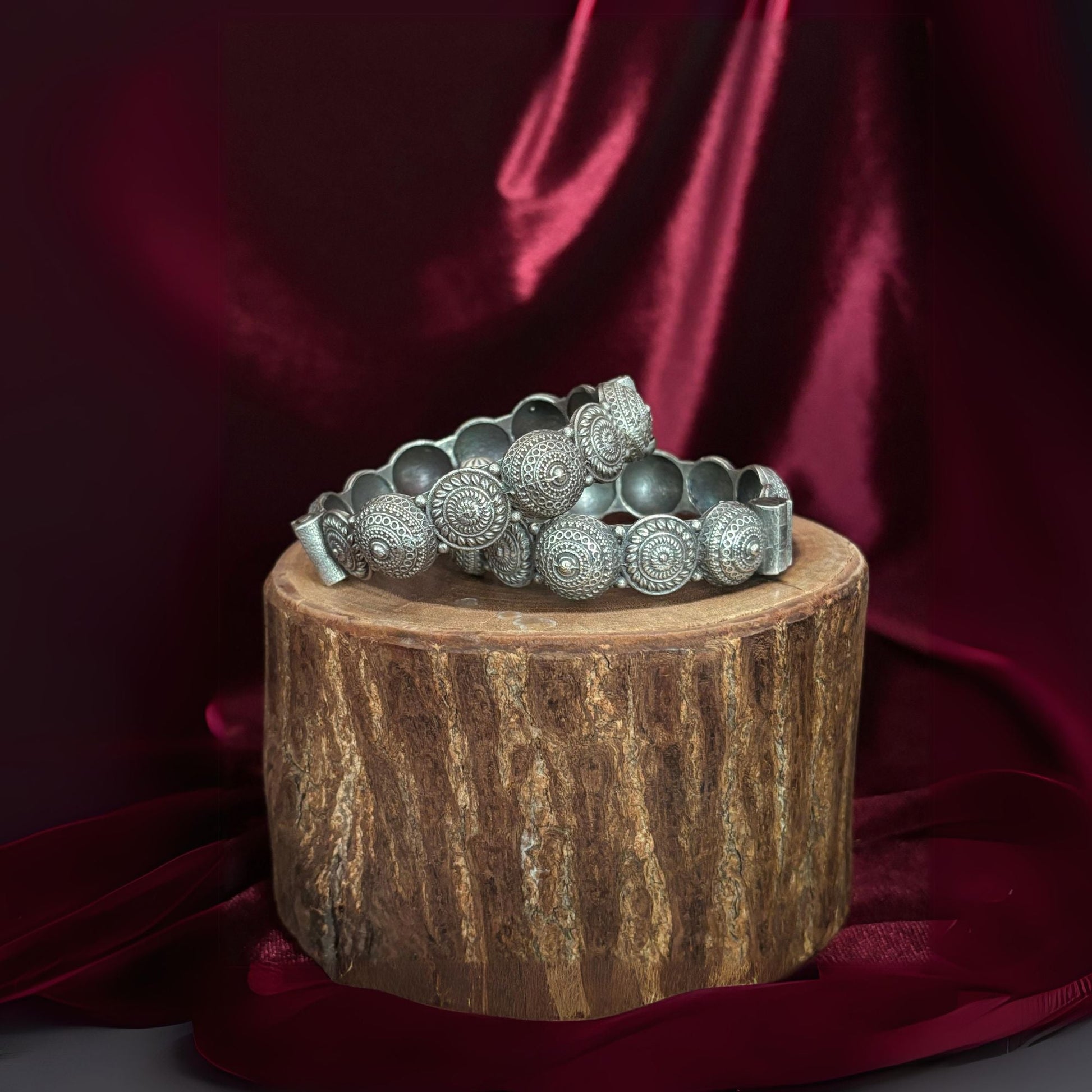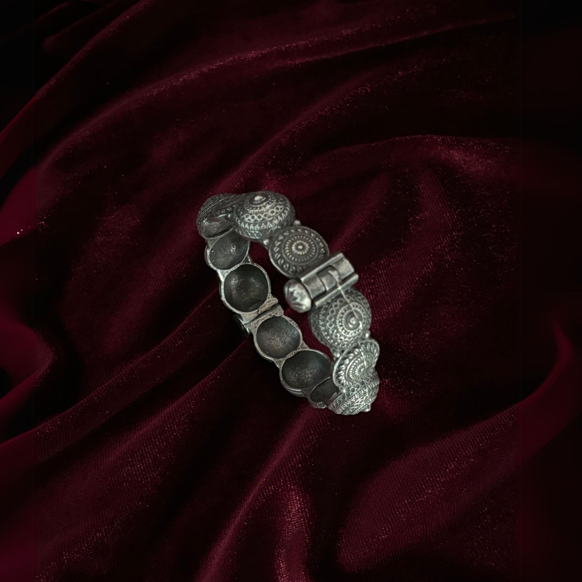 This exquisite bangle boasts a unique design with intricately carved circular motifs. The oxidized silver finish adds a touch of vintage charm, making it a versatile accessory. The screw closure ensures a secure and comfortable fit. It can be paired with a simple kurta and palazzo pants for a chic and minimalist look, or with a vibrant lehenga for a more festive ensemble.