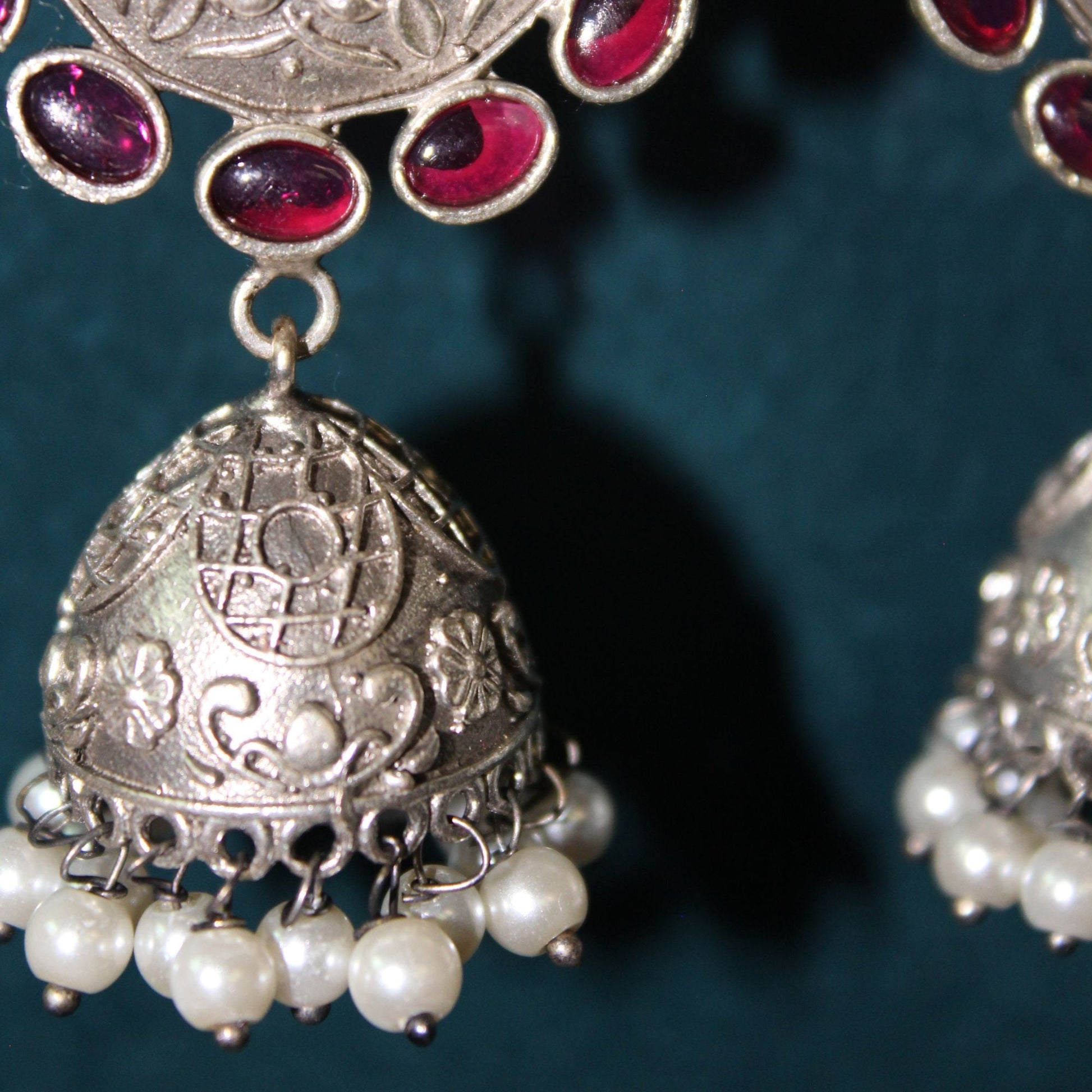 These exquisite jhumkas are a stunning blend of traditional craftsmanship and modern elegance. The intricate silverwork and vibrant crimson stones create a captivating contrast. Perfect for elevating your ethnic attire or adding a touch of Indian heritage to your contemporary style.
