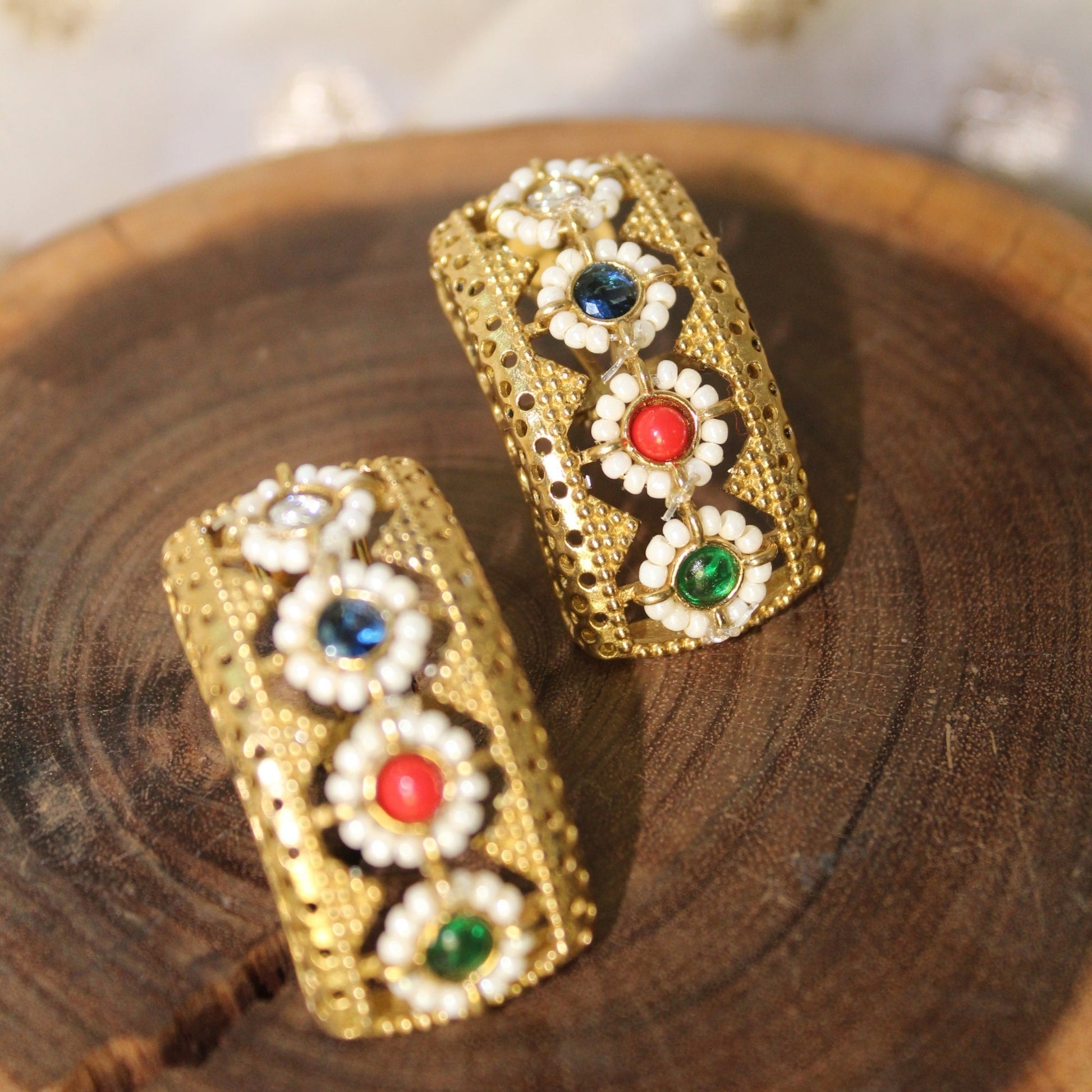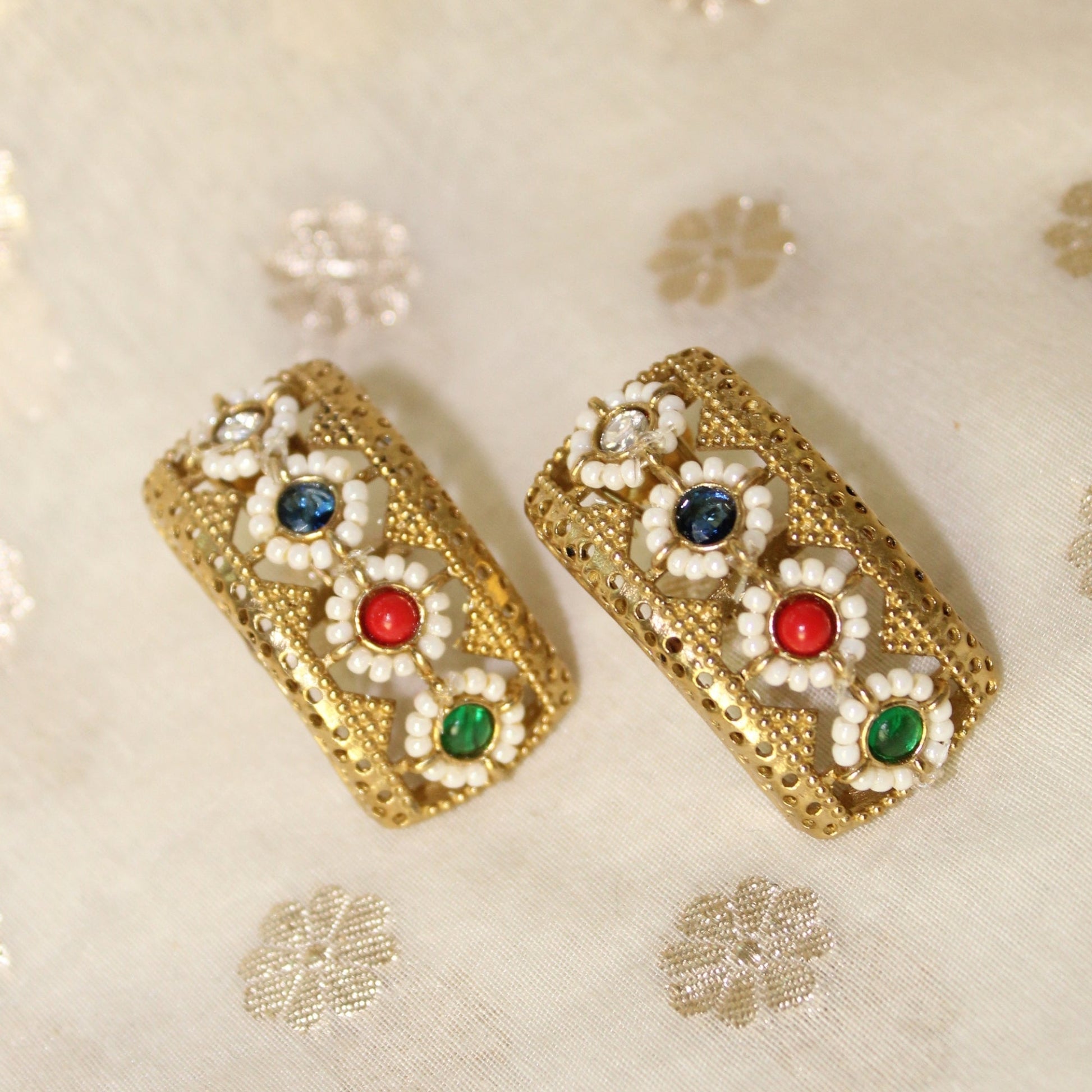 Textured gold-toned half hoop earrings with inlaid colored stones (red, green, blue) and pearl accents. Unique, slightly curved design. Pushback closure.
