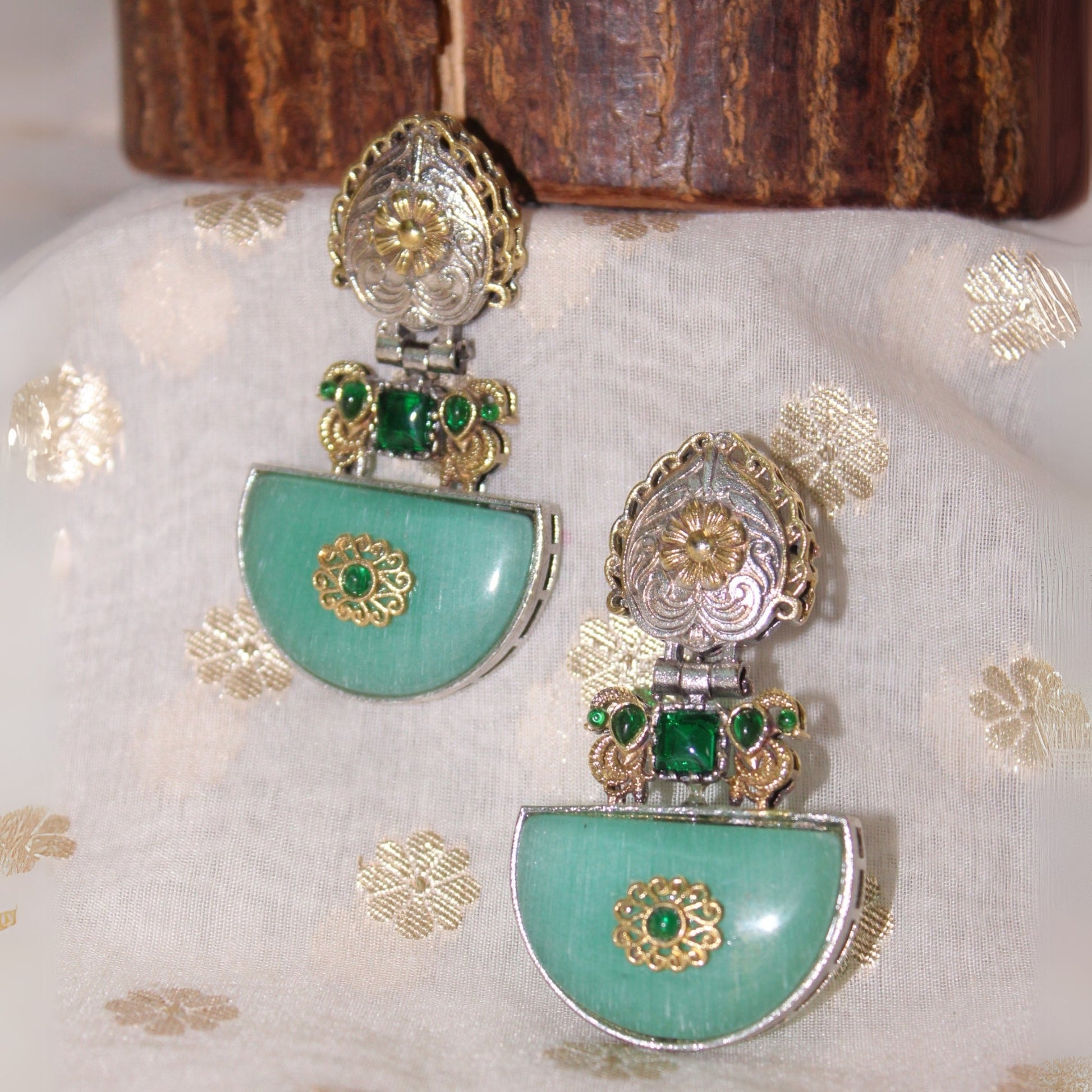 Unique earrings with a mix of silver and gold tones, featuring a half-moon shape in a calming green. Intricate details and green stone accents add charm. Pushback closure for comfortable wear.