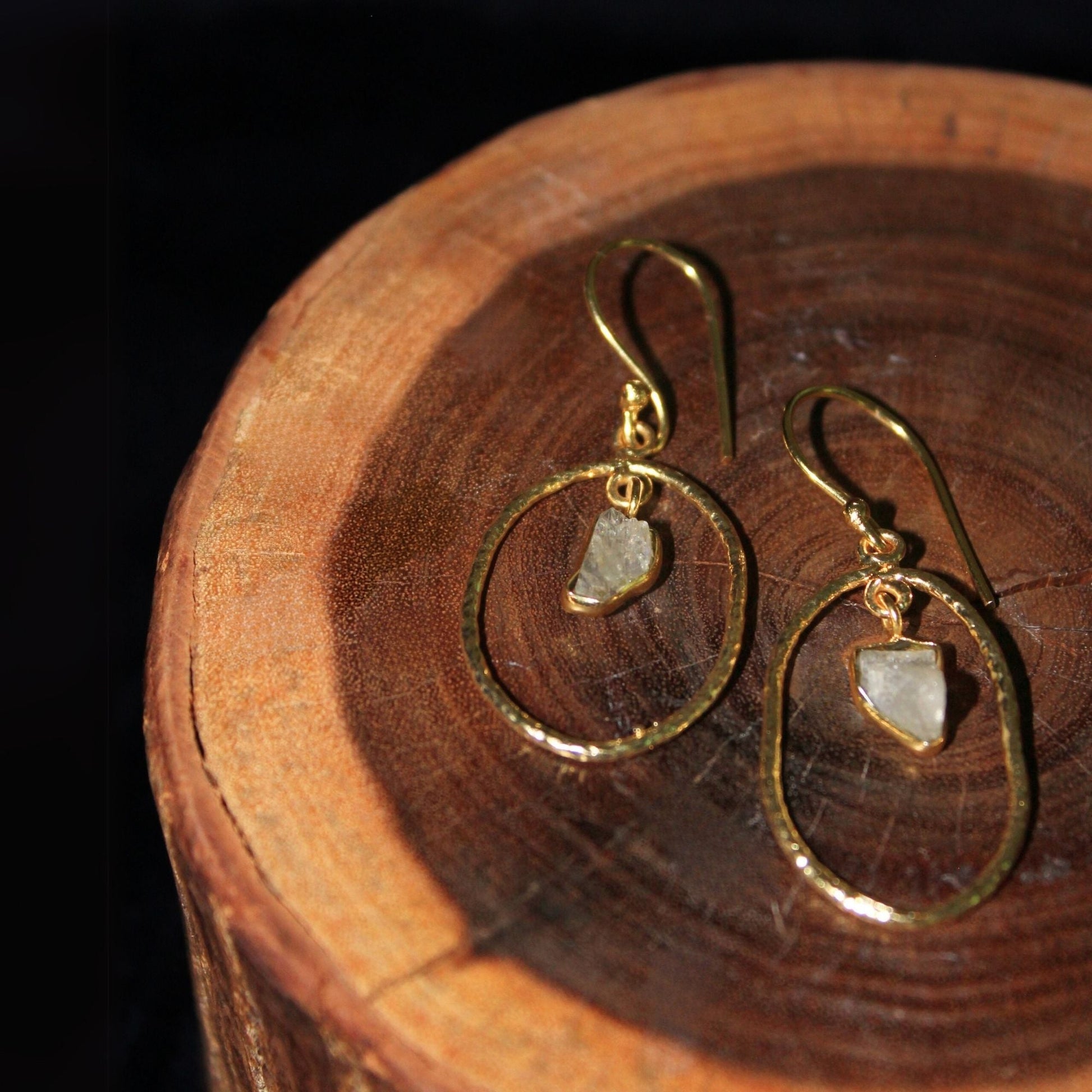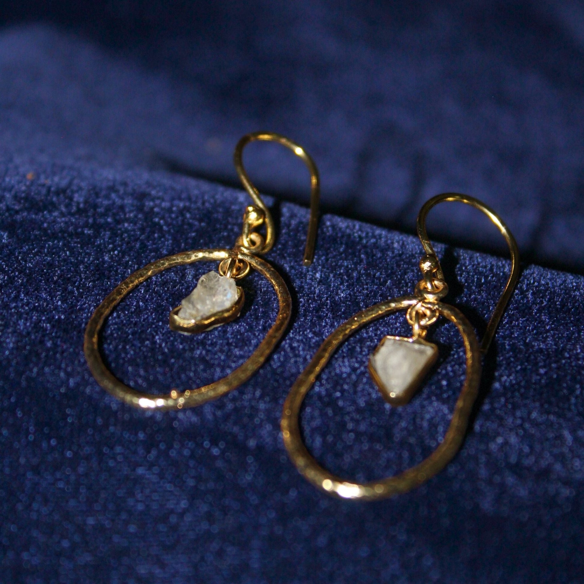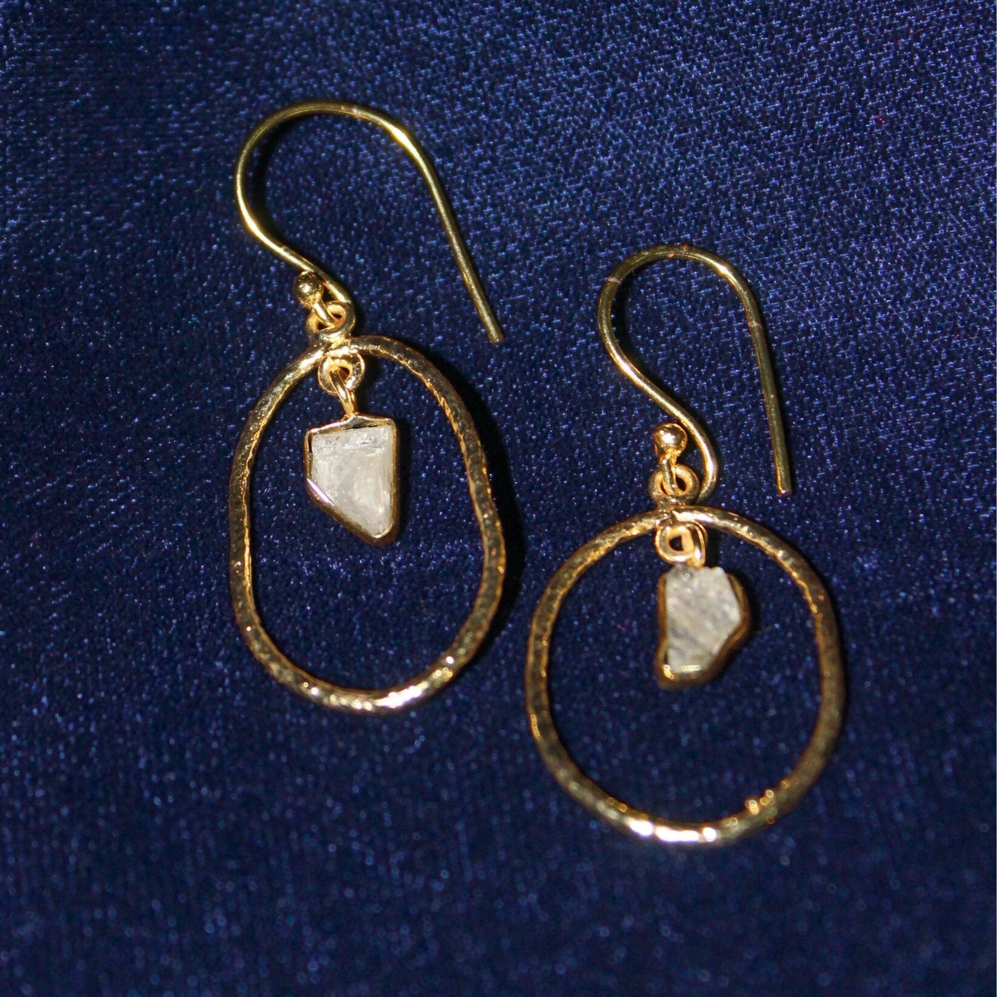 These elegant earrings feature a delicate oval frame with a touch of gold, showcasing a captivating raw stone at its heart. The sliding closure ensures a comfortable and adjustable fit. Pair them with a simple dress and heels for a touch of effortless sophistication, or with a casual outfit for a touch of bohemian flair.