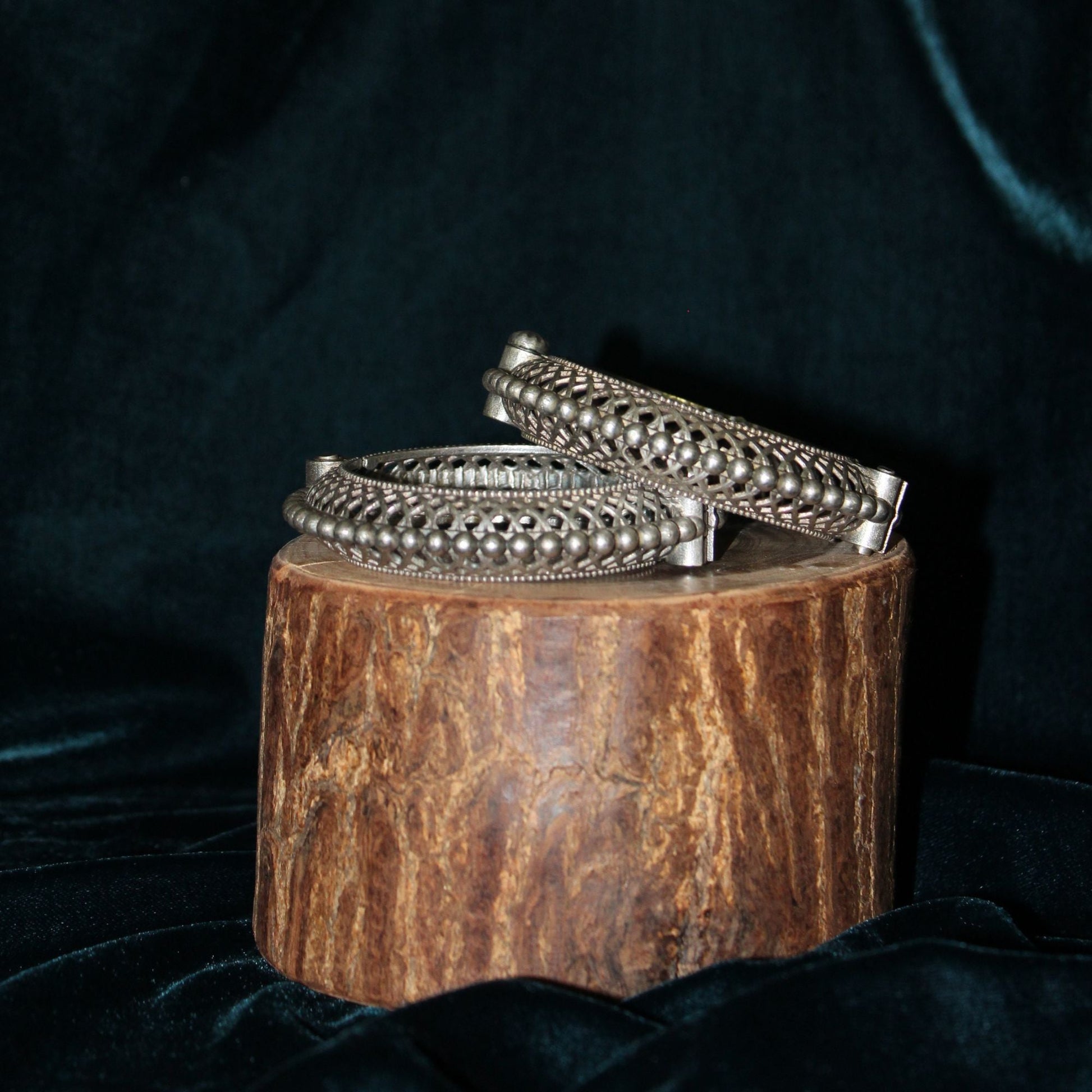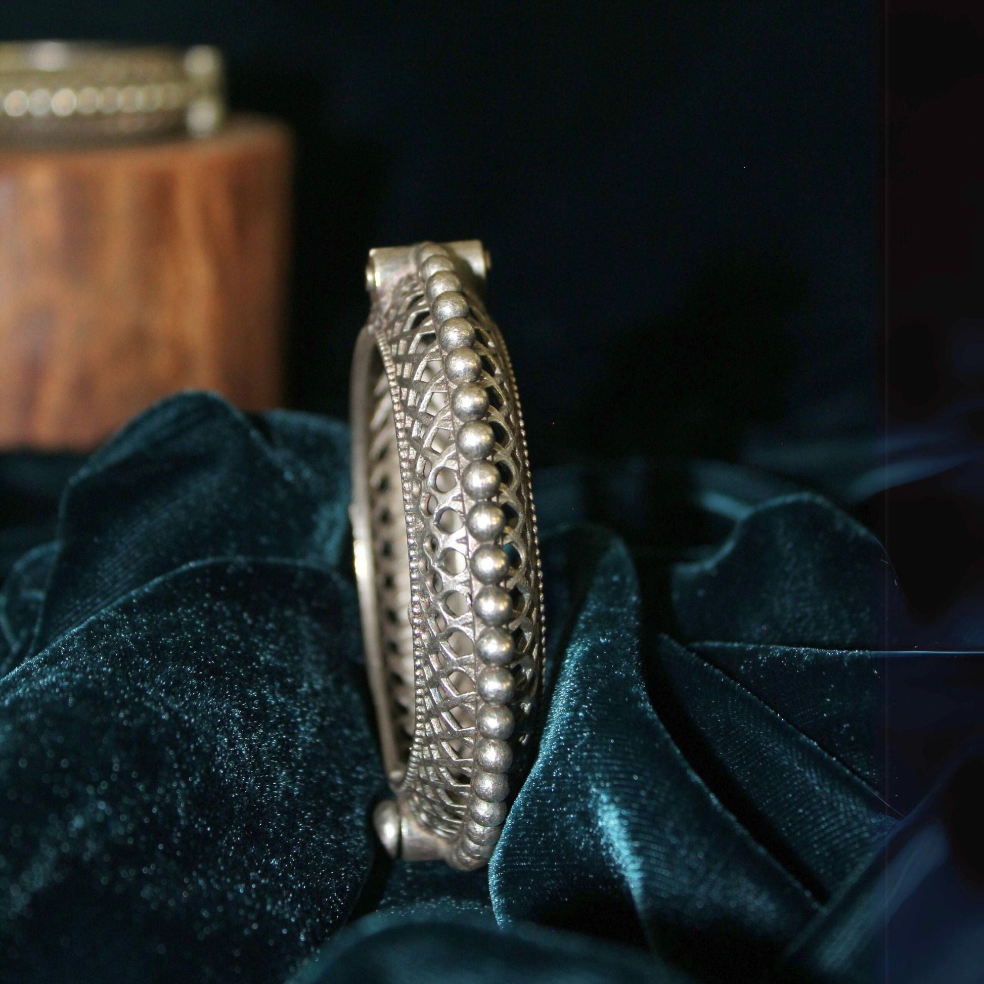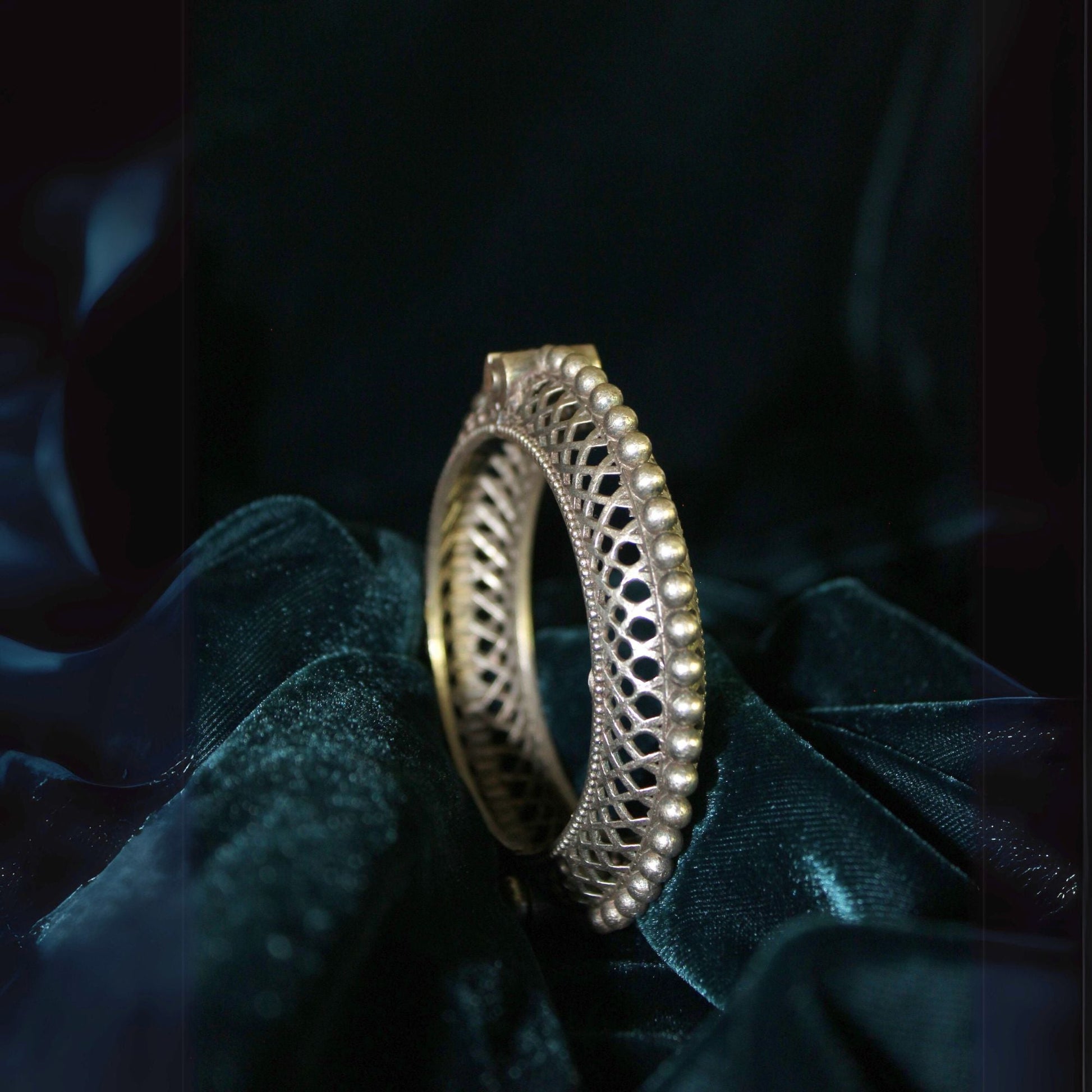 This enchanting bangle features a captivating latticework design, creating a mesmerizing interplay of light and shadow. The screw closure ensures a secure and comfortable fit. Pair them with a simple kurta and palazzo pants for a touch of bohemian chic, or with a vibrant lehenga for a more festive look.
