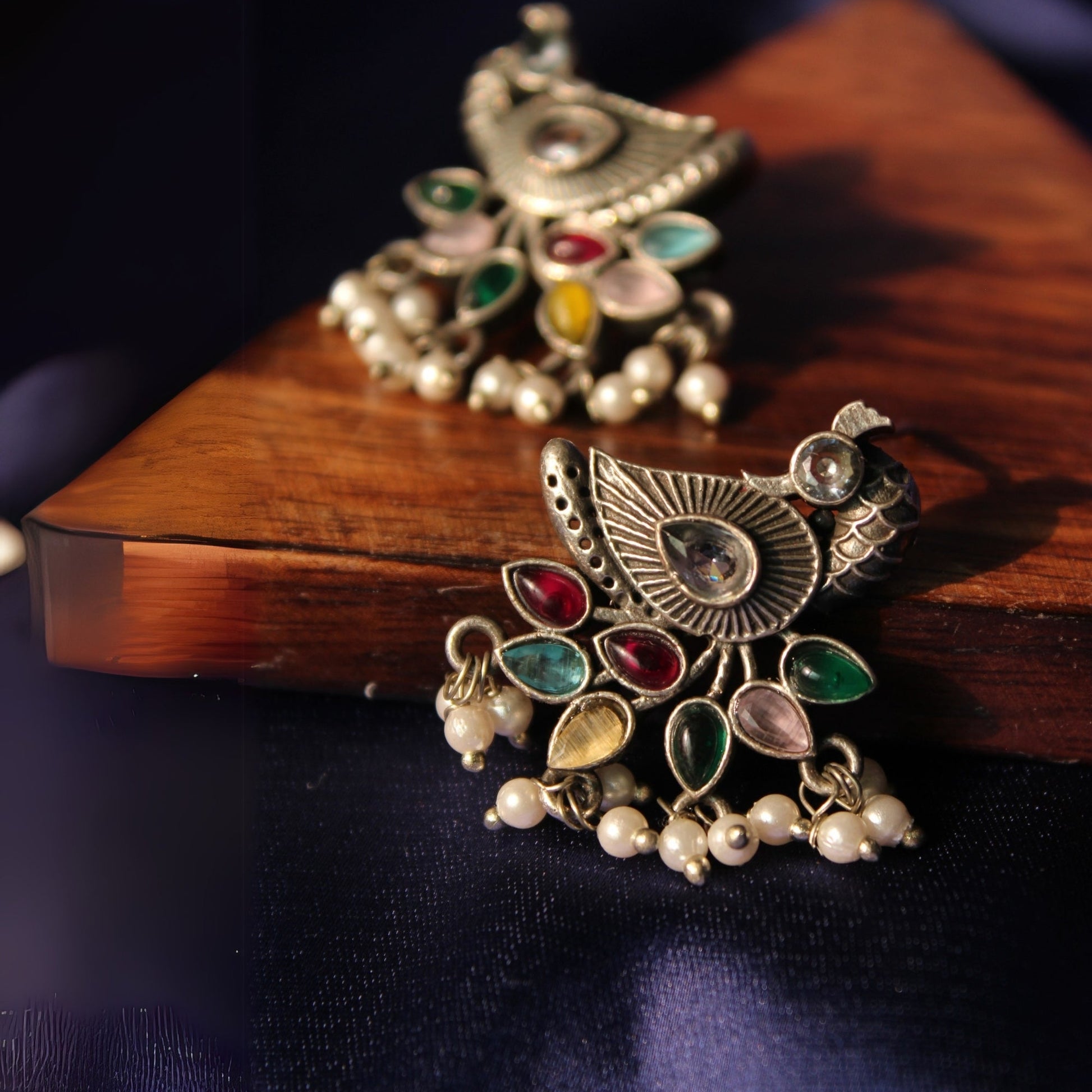 Oxidized silver-toned peacock earrings featuring a variety of colorful stones and delicate pearl drops. Intricate detailing and a cluster design add charm. These unique earrings offer a bohemian, artistic touch. Hook closure for comfortable wear.