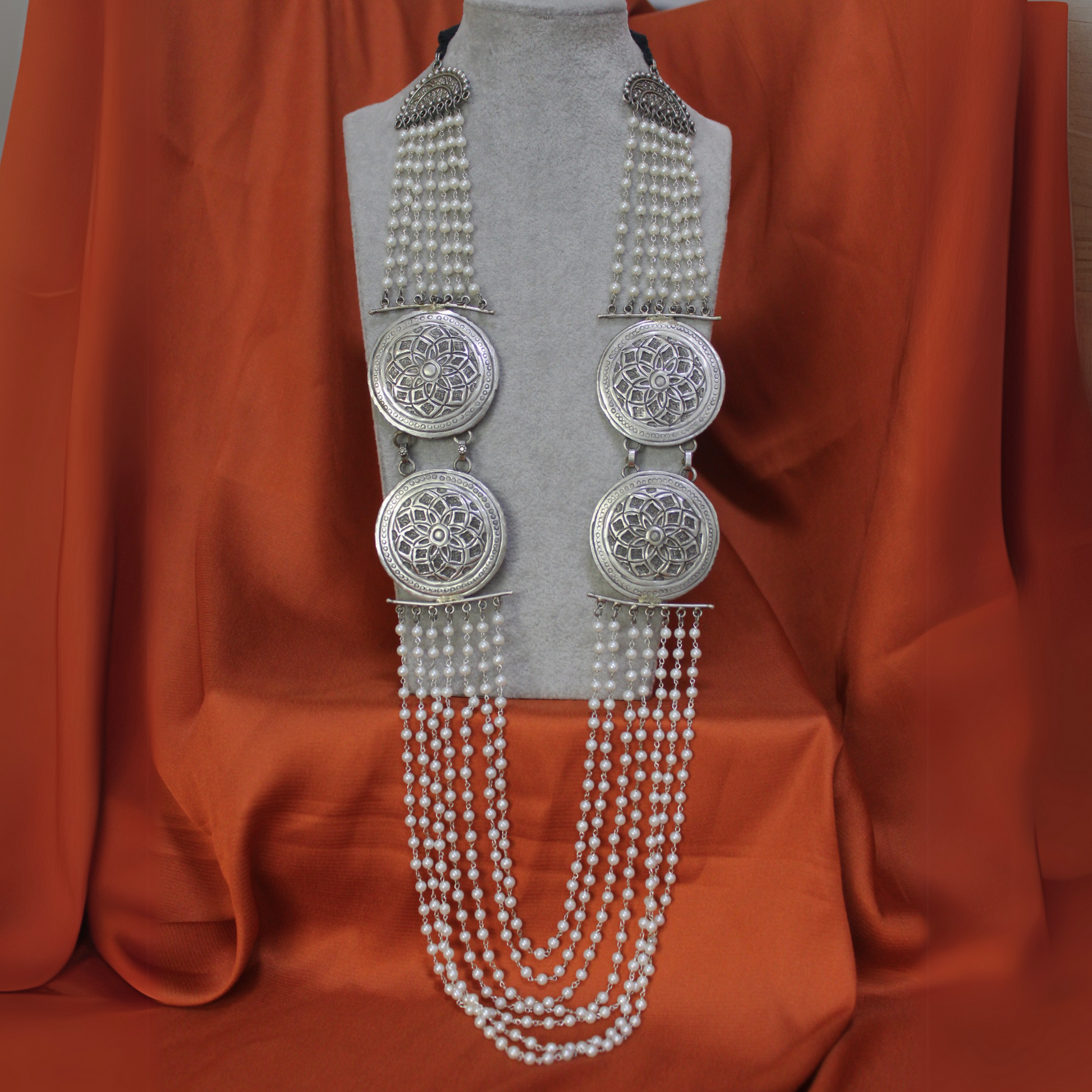This magnificent silver necklace is a stunning statement piece that exudes elegance and sophistication. The intricate detailing on the circular pendants, combined with the cascading layers of beads, creates a truly regal look. The adjustable closure ensures a comfortable fit for various necklines. This necklace is perfect for adding a touch of glamour to any formal or special occasion outfit.