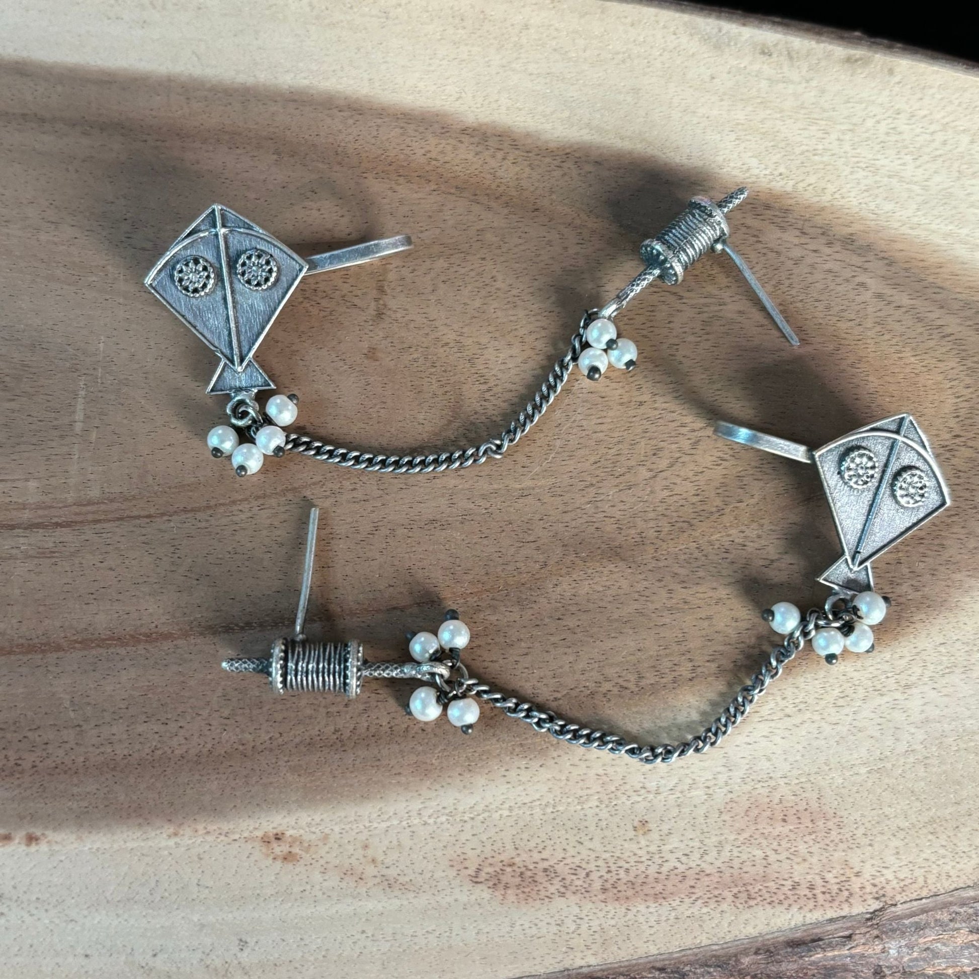 Soar to new heights with these playful kite-inspired ear cuffs. The intricate design features a silver-toned kite motif adorned with delicate pearls and a playful thread spool charm. The secure push-back stopper closure ensures comfortable wear. Pair them with a casual outfit for a touch of whimsy or add a touch of Indian heritage to your everyday look.