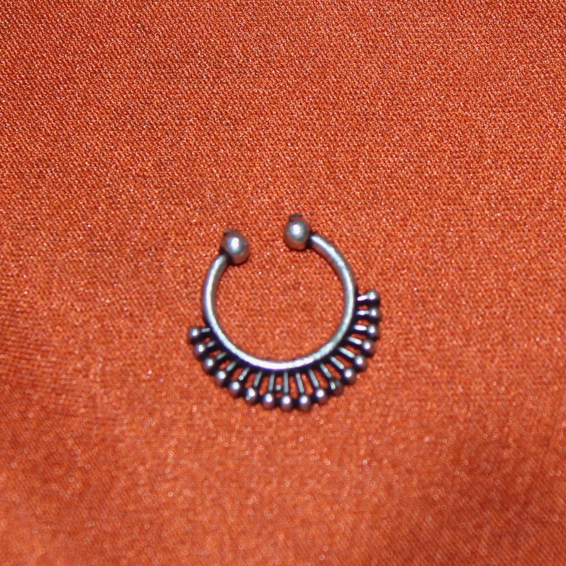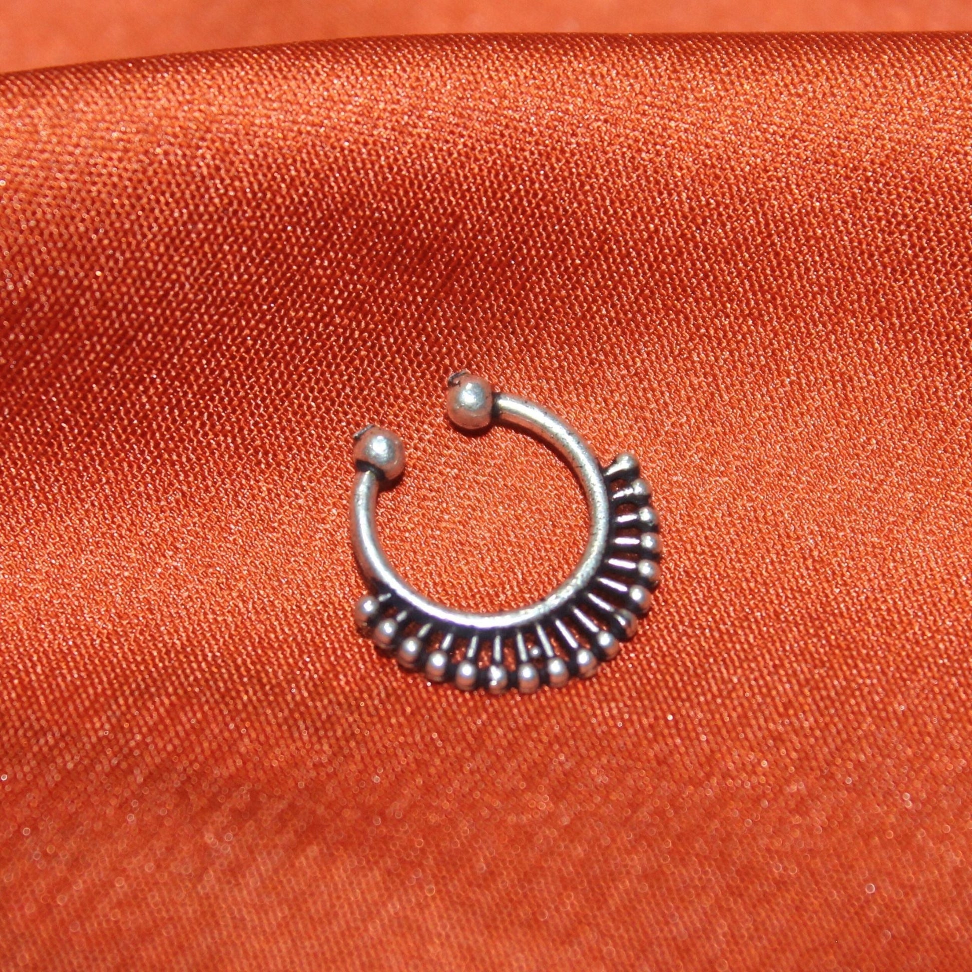 This exquisite nose ring features a captivating sunburst design, adding a touch of elegance to your look. The delicate details and smooth finish make it a comfortable and stylish accessory. This nose ring is perfect for adding a touch of traditional charm to any outfit. Pair it with a saree or anarkali for a classic Indian look, or with a simple dress and heels for a touch of bohemian chic.