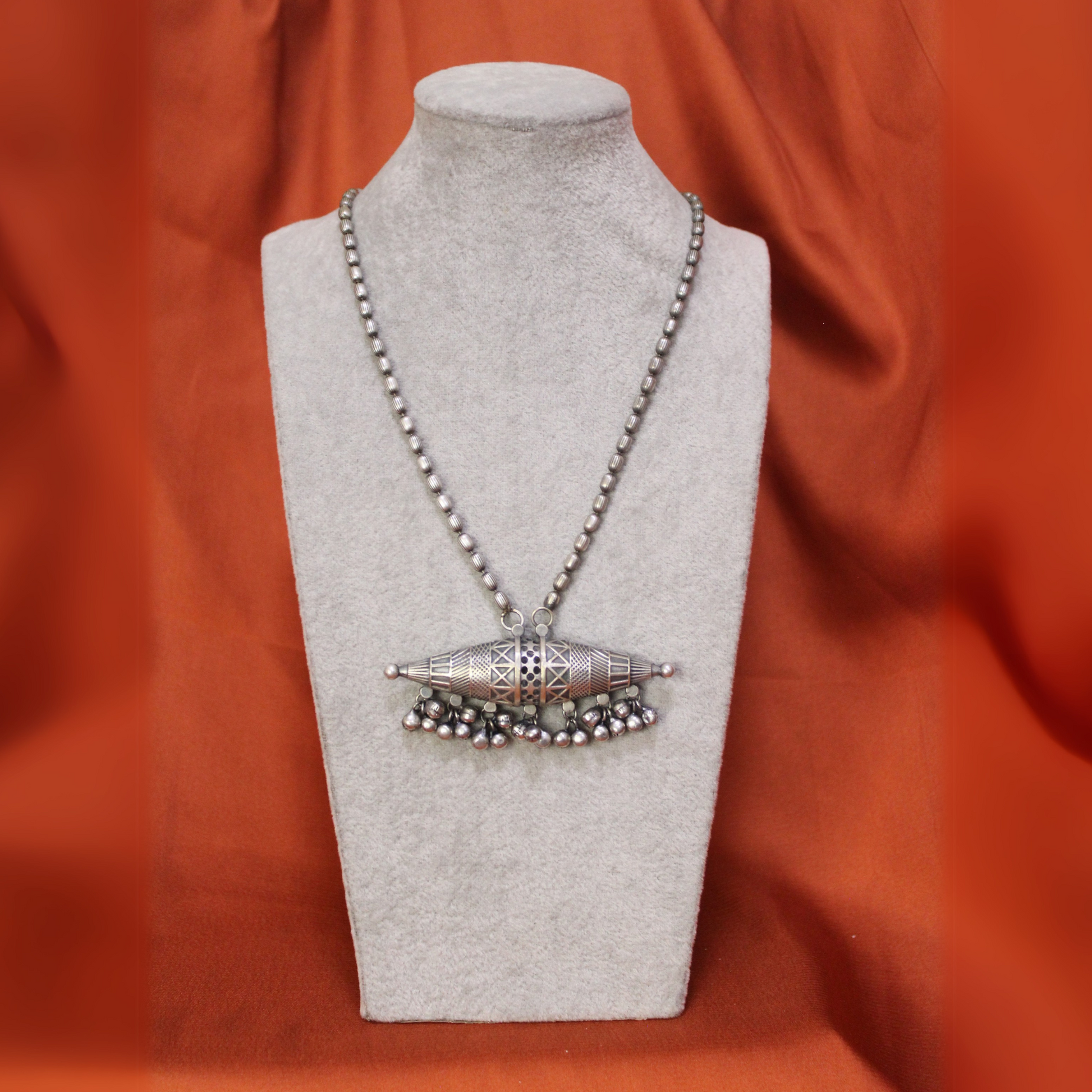This stunning silver necklace is a testament to traditional craftsmanship. The intricate beadwork and unique design elements create a captivating look. The adjustable closure ensures a comfortable fit for various necklines. Pair it with a casual outfit for a touch of ethnic flair.