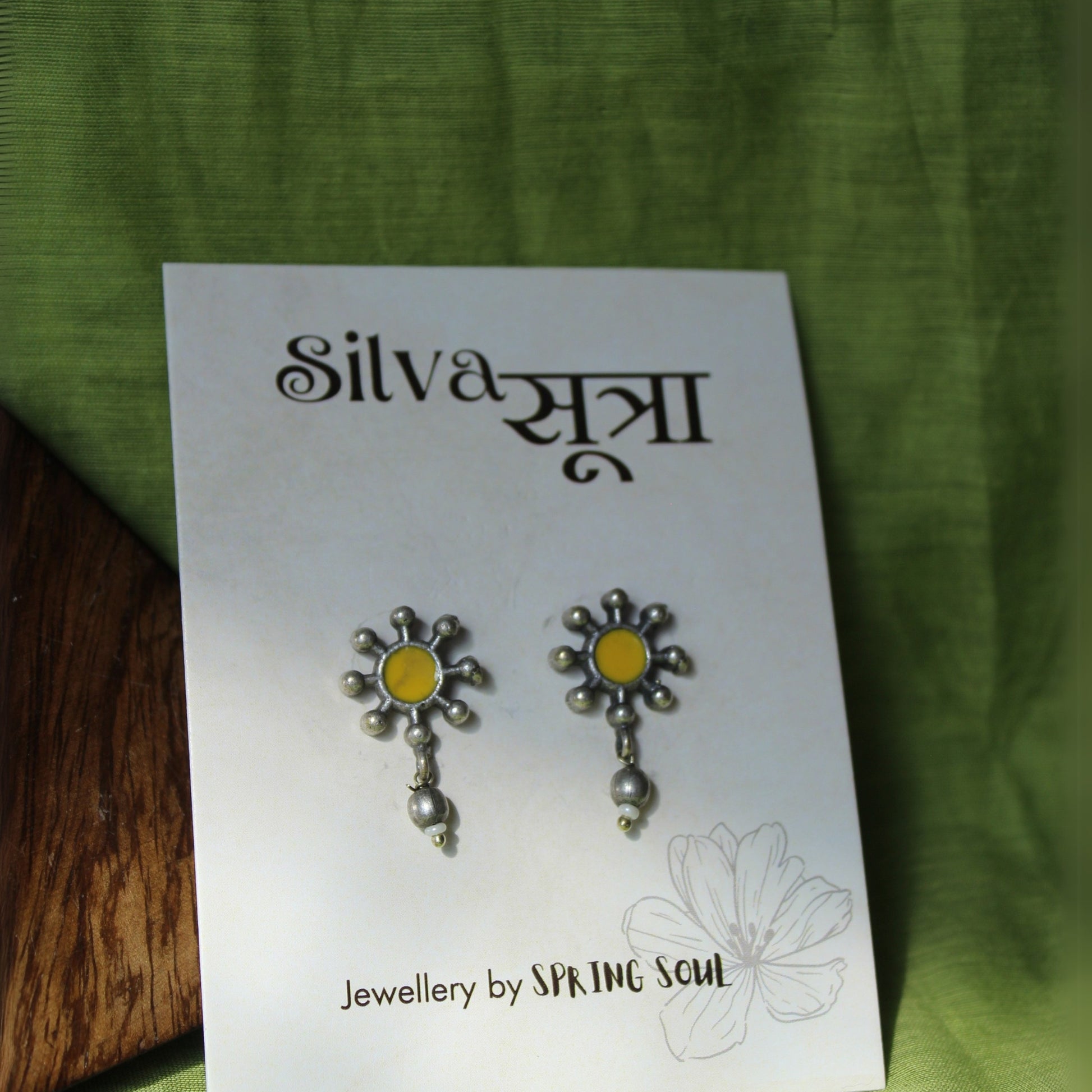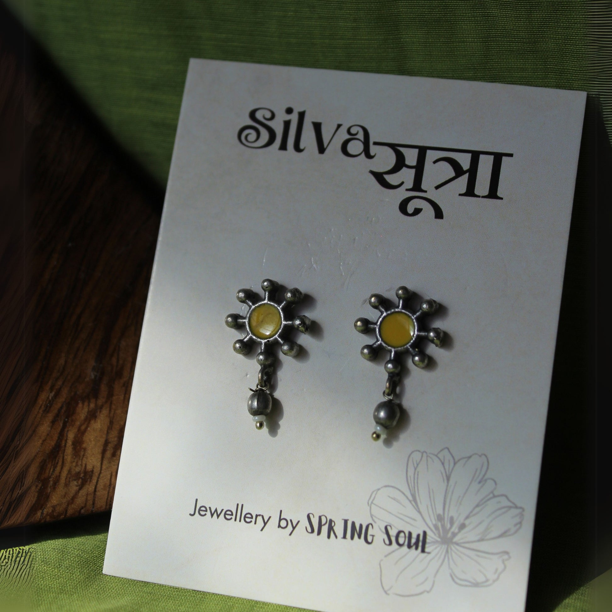 Charming oxidized silver earrings feature a central mustard yellow stone, encircled by delicate silver studs reminiscent of sun rays or flower petals. A small bead dangles gracefully below, adding a touch of rustic elegance to this unique design.
