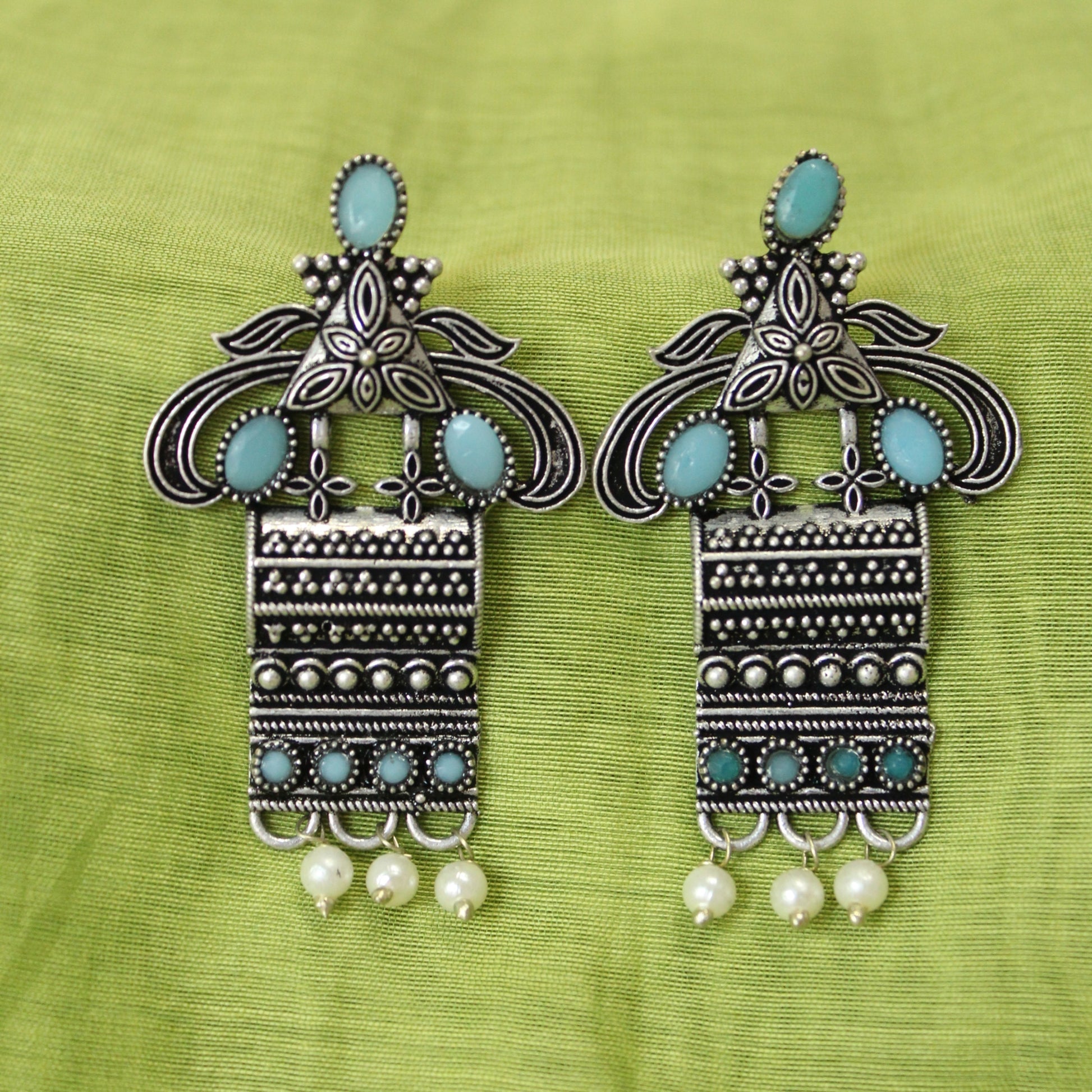 Oxidized silver-toned earrings with a unique, elongated shape. Features teal-colored stones, intricate detailing, and small pearl accents. These earrings offer a tribal-inspired, bohemian look. Pushback closure.