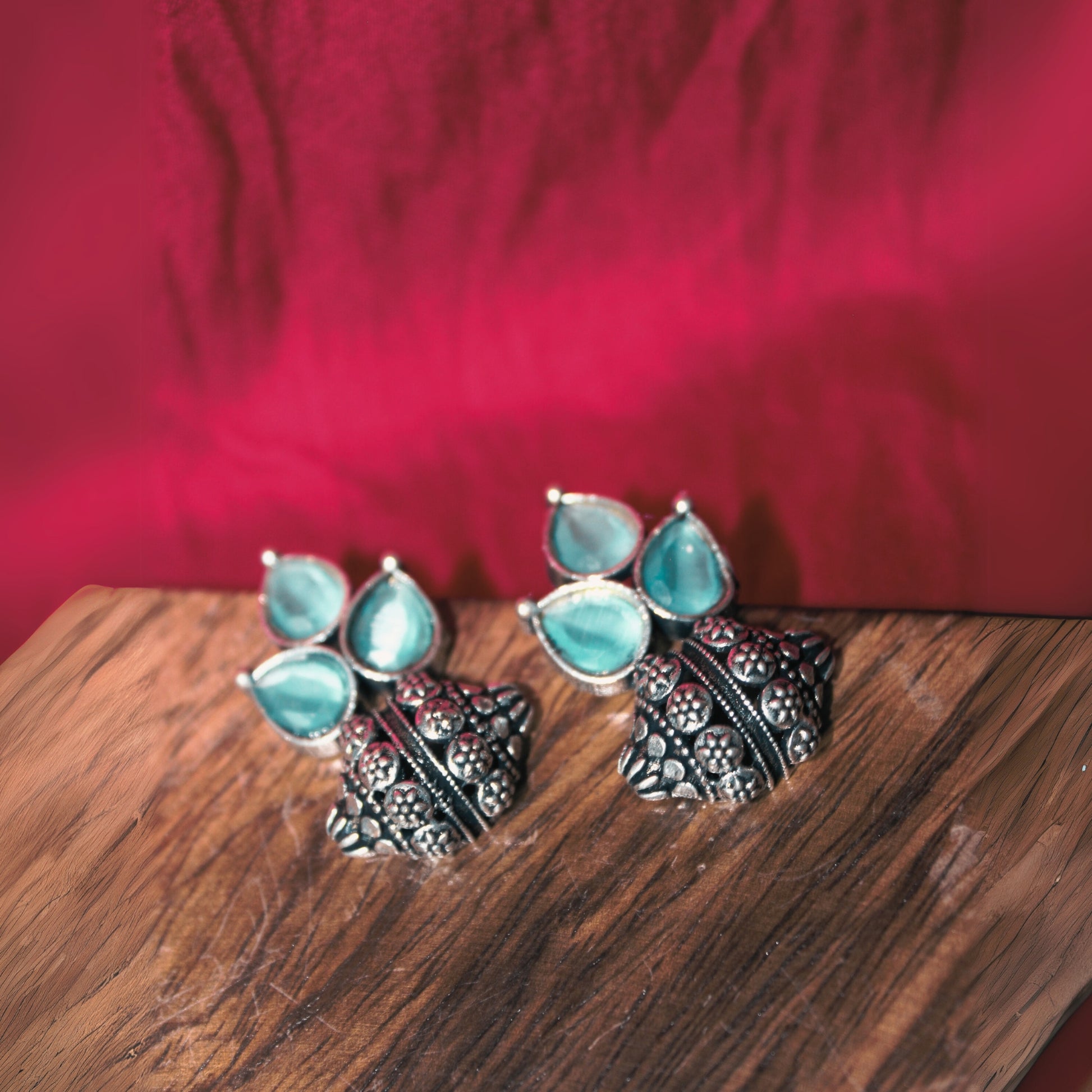 Mesmerising oxidized silver earrings feature three elegant Aqua teardrop-shaped stones arranged as a cluster. Below, an intricately detailed spherical base adds a touch of bohemian charm and unique texture to these captivating studs.