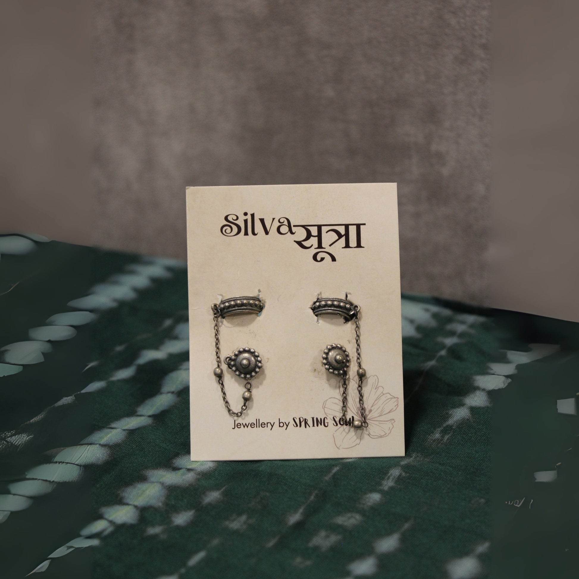 An oxidized silver stud connects to a textured hoop via a delicate chain, forming a stylish ear cuff. This unique design elegantly adorns the ear, blending bohemian charm with contemporary flair for a distinctive statement.